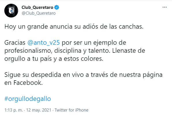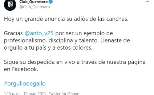 En los últimos minutos, y mediante una conferencia de prensa, el ecuatoriano anunció no solo su salida de Querétaro, sino también su retiro del futbol. La misma se dio de manera emotiva y hasta terminó en lágrimas.