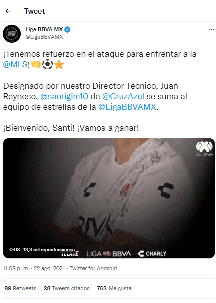 “¡Tenemos refuerzo en el ataque para enfrentar a la @MLS! Designado por nuestro Director Técnico, Juan Reynoso, @santigim10 de @CruzAzul se suma al equipo de estrellas de la @LigaBBVAMX. ¡Bienvenido, Santi! ¡Vamos a ganar!”, escribieron.