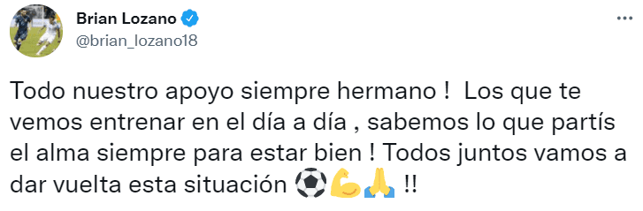 “Todo nuestro apoyo siempre hermano ! Los que te vemos entrenar en el día a día , sabemos lo que partís el alma siempre para estar bien ! Todos juntos vamos a dar vuelta esta situación“, fueron las palabras de Brian Lozano.