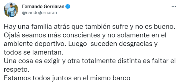 “Hay una familia atrás que también sufre y no es bueno. Ojalá seamos más conscientes y no solamente en el ambiente deportivo. Luego suceden desgracias y todos se lamentan. Una cosa es exigir y otra totalmente distinta es faltar el respeto“, escribió Fernando Gorriarán.
