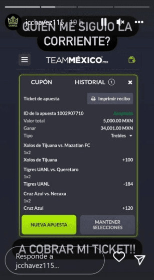 “¿Quién me siguió la corriente? ¡A cobrar mi ticket”, escribió el nuevo gurú del futbol mexicano y las apuestas en una historia de Instagram en la que compartió el resultado de su pronóstico, que lo llevó a ganarse nada menos que 34 mil pesos mexicanos. La próxima pase el dato, Leyenda.