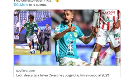 Según información de César Luis Merlo en el sitio SoyFiera, León no contará con Julien Celestine y Jorge Díaz Price durante el Clausura 2023. El francés y el mexicano estarían ejercitándose por fuera del grupo de 25 jugadores que realizan la pretemporada,a la espera de que encuentren un nuevo destino, dentro o fuera de México.