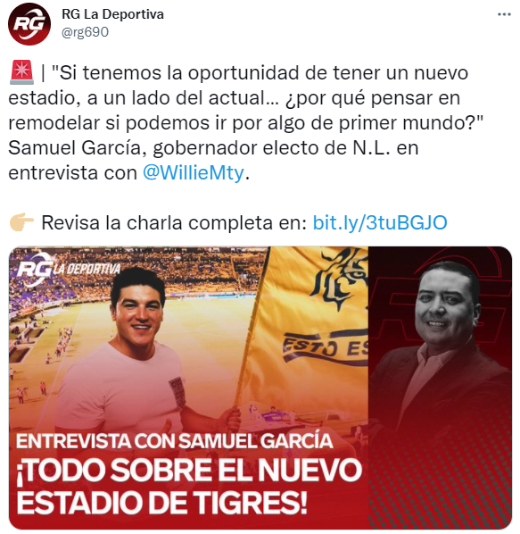 Dentro de las promesas de campaña del gobernador electo de Nuevo León, Samuel García, se encontraba la de construir un nuevo estadio para Tigres UANL. En las últimas horas, el mandatario se mostró cercano a Miguel Herrera y jugadores de los Felinos en la renovaciónde una escuela en Monterrey, y luego se pronunció públicamente respecto a la iniciativa del inmueble.
