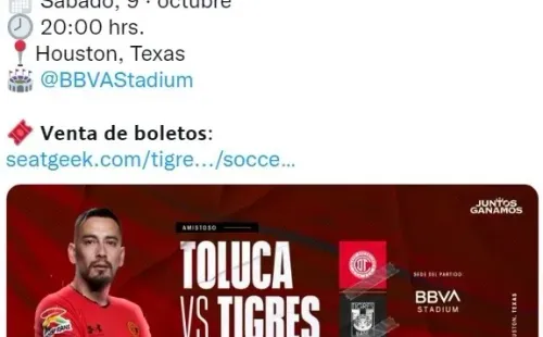 Tigres UANL y Toluca se enfrentarán HOY, sábado 9 de octubre. El duelo entre ambas escuadras está pactado a las 20:00 horas (hora de México) y tendrá lugar en el BBVA StadiumdeHouston, Texas.