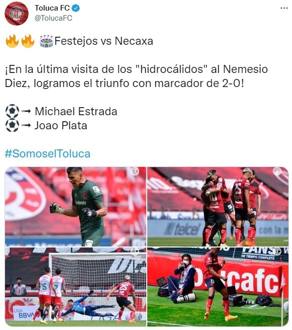 ¿Cómo salieron en el partido más reciente que jugaron entre sí?Cuando se midieron por el Clausura 2021, Toluca ganó por 2-0 como local con goles deMichael Estrada yJoão Plata. Mientras que Necaxa no se impone oficialmente desde el 31 de octubre del 2020, en el 3-2 logrado en su casa con tantos deLucas Passerini,Unai Bilbao, que dieron vuelta la apertura previa deDavid Cabrera, además de contar con el descuento deRubens Sambueza. Pero los “Rayos” no ganan en el Nemesio Diez desde el 19 de enero del 2020, en otro 3-2 gracias al doblete deMauro Quiroga,José Doldán, sabiendo que de manera provisoriaLeonardo Fernández y Luis Hernández habían invertido el 0-1.