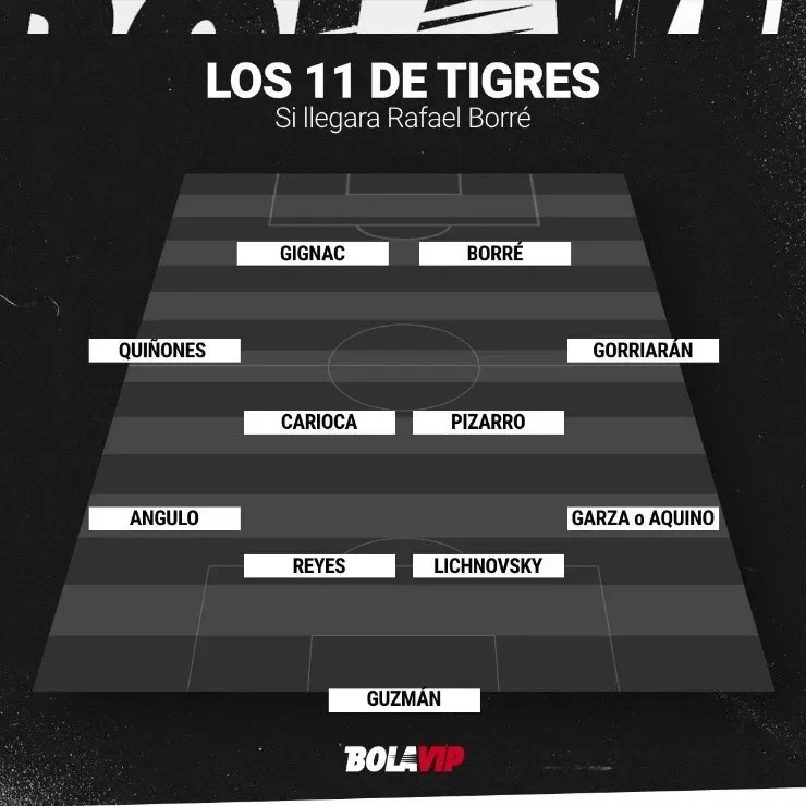 De acuerdo a las últimas elecciones del DT argentino, desde Bolavip creemos que este podría ser el 11 de Tigres con Rafa Borré: Nahuel Guzmán; Javier Aquino o Jesús Garza, Igor Lichnovsky, Diego Reyes, Jesús Angulo; Guido Pizarro, Rafael Carioca; Fernando Gorriarán, Luis Quiñones; André-Pierre Gignac y Rafael Borré.