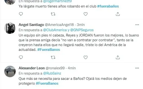 “Un equipo sin pies ni cabeza, Reyes y JORDAN fueron los mejores, lo bueno que la prensa amiga decía no ‘van a contratar por contratar’, tanto se la creyeron hasta ellos que no llegará nadie, triste lo del América de la actualidad. #FueraBanos”, fue uno de los tantos fanáticos que estallaron ante Baños tras una nueva decepción de América en la Liga MX.