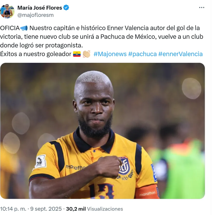 Según informó la periodista María José Flores, Pachuca llegó a un acuerdo para que Enner Valencia se sume al club. El delantero ecuatoriano llega proveniente del Inter de Porto Alegre, listo para aportar experiencia además de goles que es lo primordial.