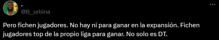 “Fichen jugadores. No hay ni para ganar en la Liga de Expansión. Fichen jugadores top de la propia liga para ganar. No es solo el DT”, señaló un usuario en X (ex Twitter). Asimismo, otros agregaron: “Si no le traen refuerzos de experiencia y calidad va a seguir siendo la misma historia de los últimos años”, “ahora traigan buenos jugadores, el entrenador no juega”, “Ya nada más faltan los refuerzos” y “ahora lo que se ocupa, jugadores de calidad, con huevos y que sepan jugar al futbol”.