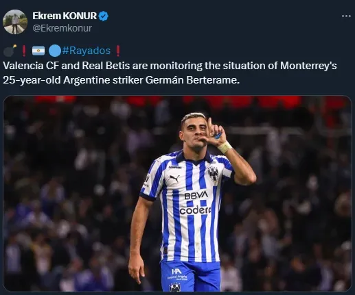 A pesar de la negativa de Berterame de llegar a la MLS, las alarmas siguen encendidas en Rayados. Eso se debe a que, según anunció Ekrem Konur, reconocido periodista especializado en mercados de fichajes, hay dos clubes que están siguiendo de cerca la situación de Germán. Se trata de Valencia y de Real Betis.