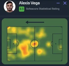 Los números del partido de Alexis Vega ante las Águilas incluyen 72 toques (involucramiento total en el juego), 4 ocasiones de gol generadas, 1 asistencia, 3 remates -1 al travesaño-, 3 gambetas exitosas, 42/47 pases precisos, 7/13 duelos ganados y 2 recuperaciones.