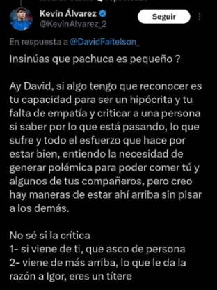 Y si bien es cierto que Kevin Álvarez terminó eliminando esa contestación, Faitelson volvió a la carga. “Si hay tanta crítica para ti, es porque muchos pensamos o pensábamos que eras un futbolista con grandes cualidades para jugar incluso más allá de México. Por otro lado, la crítica es mía, solo mía y me hago responsable de lo que digo”, replicó el periodista.
