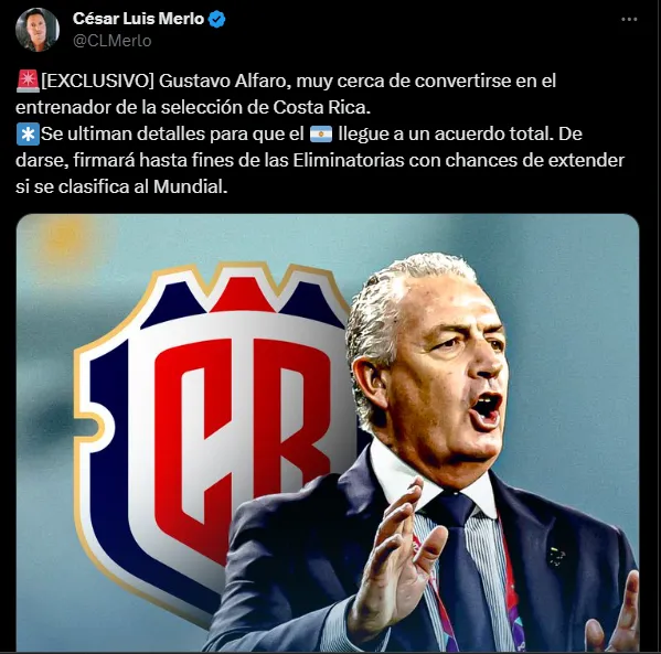 De acuerdo a lo que informó el periodista argentino César Luis Merlo, el DT que se hará cargo de Costa Rica será Gustavo Alfaro, quien dirigió a Ecuador en Qatar 2022 y quien tuvo paso por Boca Juniors, entre otros equipos.