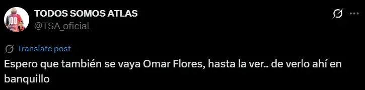Naturalmente, esta noticia despertó la inmediata reacción de algunos aficionados rojionegros, quienes no tardaron en emitir su opinión a través de las redes sociales. En ese sentido, la gran mayoría de ellos coincidió en que el ciclo de Pineda en el club ya estaba agotado, aunque no parecieron quedarse conformes con esto y también pidieron por la salida de Omar Flores, quien se desempeñó como auxiliar de los últimos tres técnicos que pasaron por Atlas (Benjamín Mora, Beñat San José y Gonzalo Pineda).