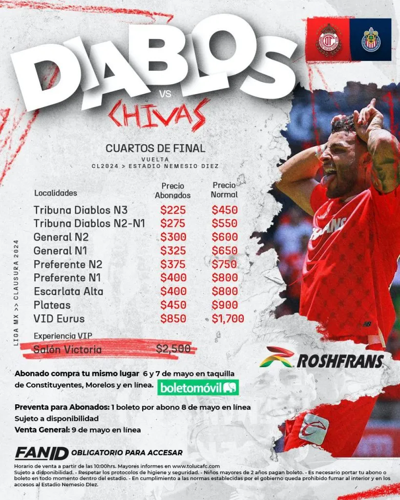 El encuentro de vuelta de los cuartos de final del Clausura 2024 de la Liga MX entre los ‘Diablos’ y el ‘Rebaño’ se disputará el próximo sábado 11 de mayo, en el Estadio Nemesio Díez, a partir de las 20.10 horas del territorio mexicano.