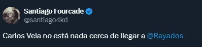 Pese a que el rumor tomó mucha fuerza en horas recientes, y hay hasta quienes dan el acuerdo como cerca, también hay quienes bajar la ilusión. En ese sentido, Santiago Fourcade se encargó de afirmar mediante las redes sociales que Vela no está cerca de llegar a Rayados.
