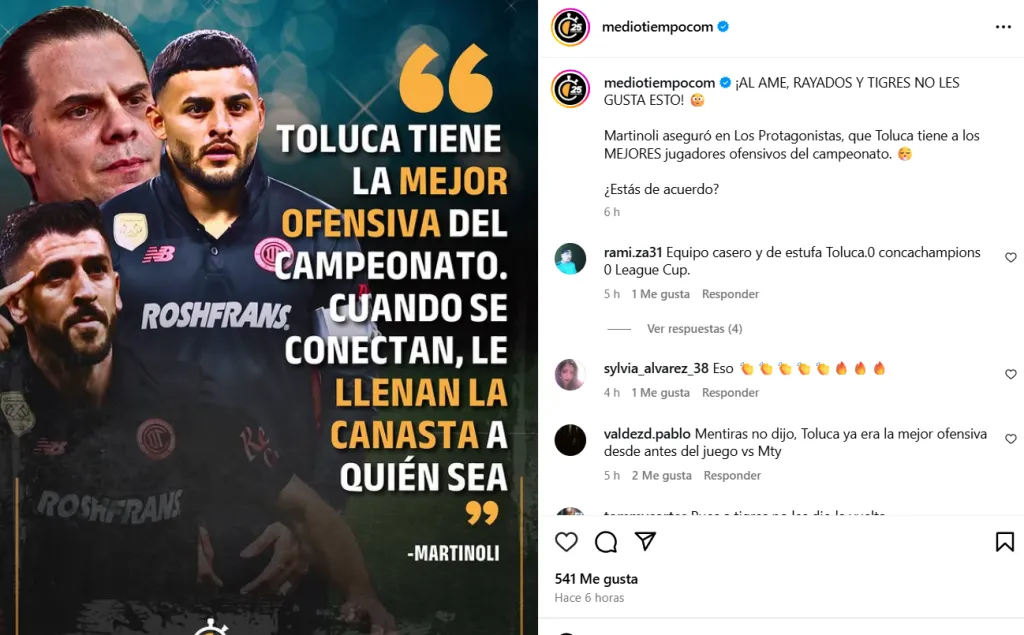 ”Toluca tiene la mejor ofensiva del campeonato. Cuando se conectan, le llenan la canasta a quién sea”, reveló Martinoli. Su opinión se basa no solo en nombres sino en el rendimiento del equipo que viene de ganar el Apertura y que va por el bicampeonato.