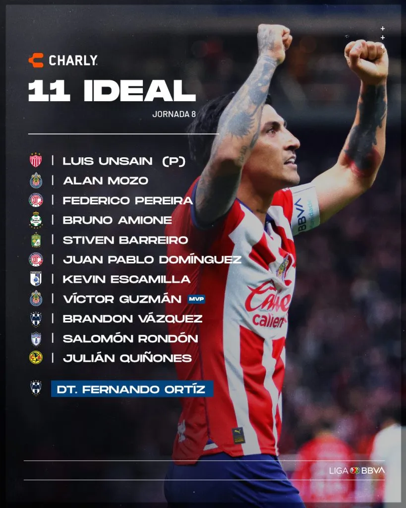 De este modo, la mejor alineación de la octava jornada según la Liga MX quedó conformada de la siguiente manera: Unsain (Necaxa); Mozo (Chivas), Pereira (Toluca), Amione (Santos), Barreiro (León); Domínguez (Toluca), Escamilla (Querétaro), Guzmán (Chivas); Quiñones (América), Vázquez (Rayados) y Rondón (Pachuca).