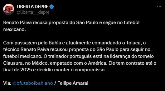De acuerdo al reporte del periodista brasileño Fellipe Amaral, São Paulo habría intentado sin éxito contratar al entrenador del conjunto escarlata, pero este agradeció el interés y dijo que no a la suculenta propuesta de la liga que ya conoce y dirigió.