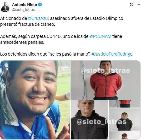 Cruz Azul por su parte dejó en claro que estaría en el proceso apoyando a los familiares que realizaron una pequeña manifestación para pedir justicia para Rodrigo. Esto, deja problemas para la UNAM que manipuló la información a conveniencia y para la Liga MX que en lugar de apoyar para la seguridad de los aficionados, sólo deslindó responsabilidades.