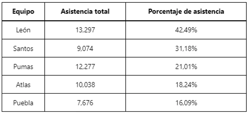En ese sentido, vale destacar que más de la mitad de los equipos que hicieron de local no consiguieron llegar al 50% de ocupación de sus respectivos recintos deportivos, de acuerdo a las cifras publicadas en la página oficial de la Liga MX. En esta situación se encontraron León (42,49%), Santos Laguna (31,18%), Pumas UNAM (21,01%), Atlas (18,24%) y Puebla (16,09%).