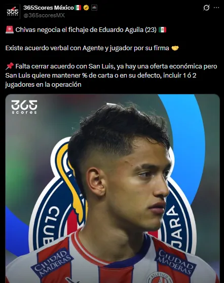 - Chivas de Guadalajara alcanzó un acuerdo verbal con el zaguero de 23 años, Eduardo Águila.
