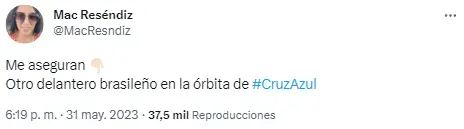 Así lo reveló la reportera de ESPN, Mac Reséndiz, quien a través de su cuenta de Twitter publicó: “Me aseguran. Otro delantero brasileño en la órbita de Cruz Azul”. De todas maneras, la fuente no se animó a dar el nombre que estaría en el radar del cuadro de La Noria, pero las especulaciones no se hicieron esperar.