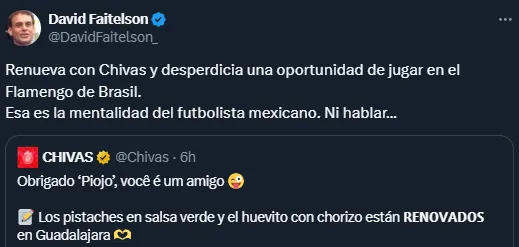 “Renueva con Chivas y desperdicia una oportunidad de jugar en el Flamengo de Brasil. Esa es la mentalidad del futbolista mexicano. Ni hablar…”, escribió Faitelson en su cuenta de X. De esta forma, David dejó más que en evidencia su descontento por la permanencia del Piojo en la Liga MX.