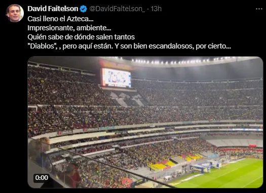 También hubo elogios para los aficionados del Toluca, que se hicieron presentes en masa en Ciudad de México para apoyar a su equipo: “Casi lleno el Azteca, impresionante ambiente: quién sabe de dónde salen tantos Diablos, pero aquí están. Y son bien escandalosos, por cierto…“.