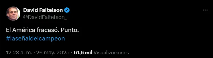 Uno de los que no dudó en expresar su opinión fue David Faitelson. Luego del partido, el periodista dejó un mensaje en sus redes sociales con una sola palabra para destrozar al América: Fracaso. “El América fracasó. Punto”, escribió en su cuenta de x.