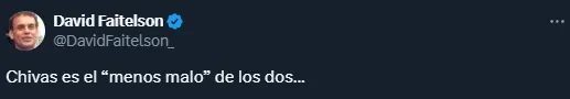David comenzó durante el juego a cuestionar el propio partido. “Chivas es el ‘menos malo’ de los dos…”, escribió, denotando su descontento con el juego en sí. Y sobre los minutos finales, con la sanción del penal sobre la hora para Atlas, el periodista volvió a la carga con nuevos mensajes.