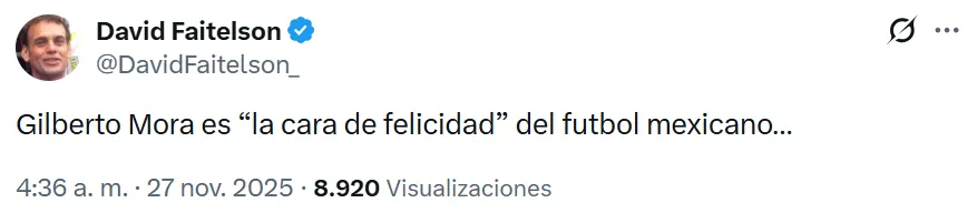 - El periodista David Faitelson describió a Gilberto Mora como “la cara de felicidad” del futbol mexicano.