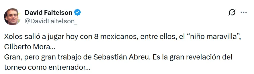 “Gilberto Mora es “la cara de felicidad” del futbol mexicano”, comentó en primer lugar. . Y agregó: “Xolos salió a jugar hoy con 8 mexicanos, entre ellos, el ‘niño maravilla’, Gilberto Mora. Gran, pero gran trabajo de Sebastián Abreu. Es la gran revelación del torneo como entrenador…”.