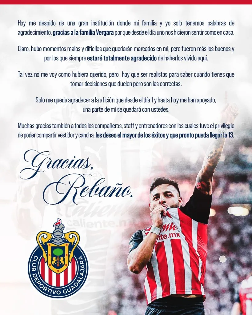 “Hoy me despido de esta gran institución donde mi familia y yo solo tenemos palabras de agradecimiento”, abrió el jugador, que reconoció su irregularidad en los últimos tiempos vistiendo los colores de las Chivas. “Hubo momentos malos y difíciles que quedarán marcados, pero fueron más los buenos que estaré totalmente agradecido de haberlos vivido aquí”, agregó Vega en la carta.