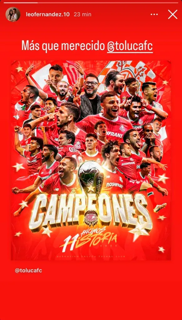 El futbolista uruguayo se pronunció en redes sociales para celebrar la obtención del Clausura 2025 del conjunto escarlata. Puntualmente, compartió el poster oficial de Toluca en sus historias de Instagram y resumió el título con tres palabras: “Más que merecido”.