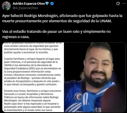 De acuerdo con la información del periodista de TUDN, Adrián Esparza Oteo, testigos presenciales mencionaron que los elementos de seguridad subieron Rodrigo Mondragón a la camioneta y aún iba con vida. Desde ahí no supieron nada de él, de acuerdo con lo detallado esto habría ocurrido en el estacionamiento de Ciudad Universitaria.