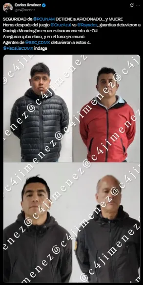 Más tarde, de acuerdo con el periodista Carlos Jiménez fueron detenidos cuatro elementos de Protección Civil UNAM, ya que supuestamente detuvieron al aficionado porque estaba en estado de ebriedad y que en el forcejeo murió. Es por ello que se mantienen hasta el momento siendo interrogados para conocer la verdad de los hechos y permitirle la justicia a los familiares de Mondragón.