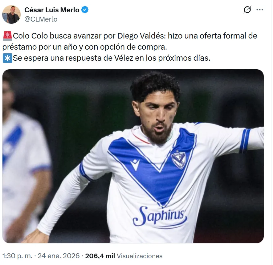 Según informó el periodista César Luis Merlo, Colo Colo inició gestiones por Diego Valdés y presentó una propuesta oficial para sumarlo a su plantel. La oferta consiste en un préstamo por un año con opción de compra, y ahora se aguarda la respuesta de Vélez Sarsfield en los próximos días.