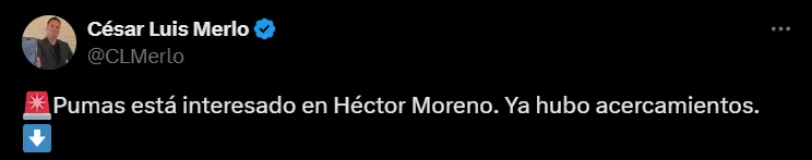 César Luis Merlo agregó que ya hubo acercamientos entre Pumas UNAM y el defensor para concretar su regreso a Ciudad Universitaria. Hasta el momento no hubo oferta formal, pero todos los caminos apuntan a que el defensor jugará en el equipo de Efraín Juárez.