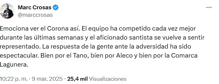 “Emociona ver el Corona así. El equipo ha competido cada vez mejor durante las últimas semanas, y el aficionado santista se vuelve a sentir representado. La respuesta de la gente ante la adversidad ha sido espectacular. Bien por el Tano, bien por Aleco y bien por la Comarca Lagunera“, escribió Crosas en sus redes sociales.