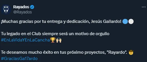 Pese a que ya se sabía de su salida, el anuncio oficial no llegó hasta este domingo. Mediante un comunicado, en el cual se resaltan sus éxitos en el club, Rayados le dio la despedida a Jesús Gallardo, y le deseó el mayor de los éxitos para sus proyectos futuros.