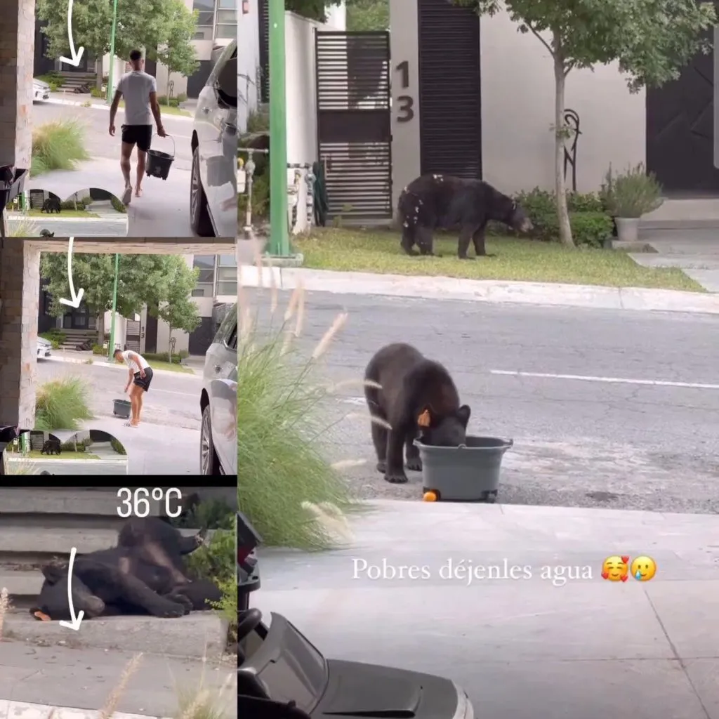 Debido a la ola de calor que está azotando a Monterrey, Maxi Meza salió a la calle y le dejó cubetas con agua a algunos osos que deambulaban por las cercanías de su casa y que se mostraron exhaustos y con sed.