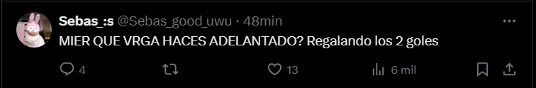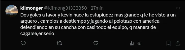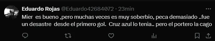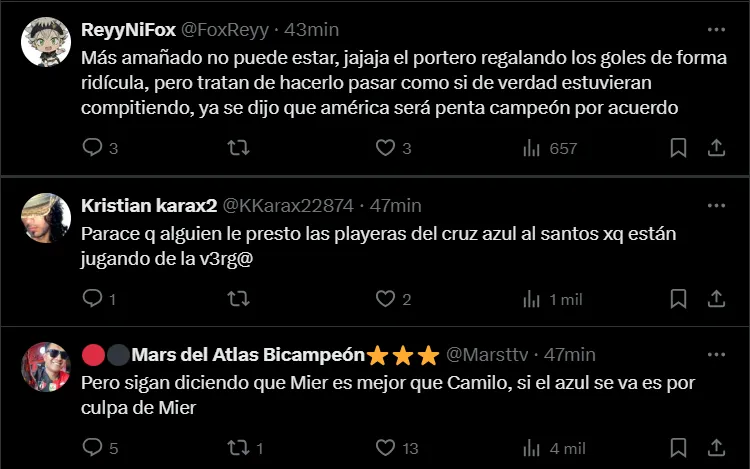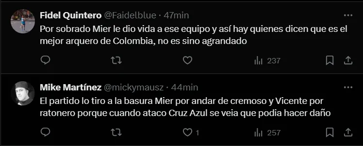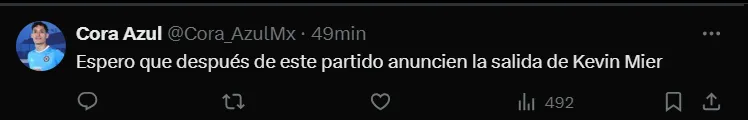 “El partido lo tiro a la basura Mier por andar de cremoso y Vicente por ratonero porque cuando ataco Cruz Azul se veia que podia hacer daño“, “Mier falló en los dos goles, no tiene perdón, don pendejadas y se acabó, necesitan un milagro“, fueron otros comentarios que se vieron en ‘X’.