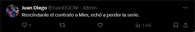 Los seguidores de la institución celeste no dudaron en apuntar contra el portero: “Mier es bueno ,pero muchas veces es muy soberbio, peca demasiado ..fue un desastre desde el primero gol. Cruz azul lo tenia.. pero el portero la cago“, “Por sobrado Mier le dio vida a ese equipo y así hay quienes dicen que es el mejor arquero de Colombia, no es sino agrandado“.