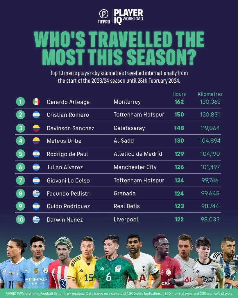 Arteaga es el futbolista que más horas viajó del mundo durante esta temporada con 162 horas contando hasta este 15 de marzo. El mexicano supera en dicho ranking a jugadores como Julián Álvarez, Darwin Núñez, Cristian Romero y Rodrigo de Paul, entre otros.