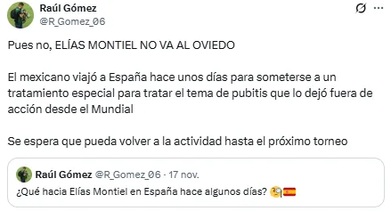 Sin embargo, se ha realizado una confirmación de lo que estaría ocurriendo con Montiel, de acuerdo con la información del periodista de Minuto Final MX en Pachuca, Raúl Gómez esta versión sería falsa, ya que el futbolista mexicano tendría otra razón suficiente para estar en el Viejo Continente y que poco tenía qué ver con esta situación.