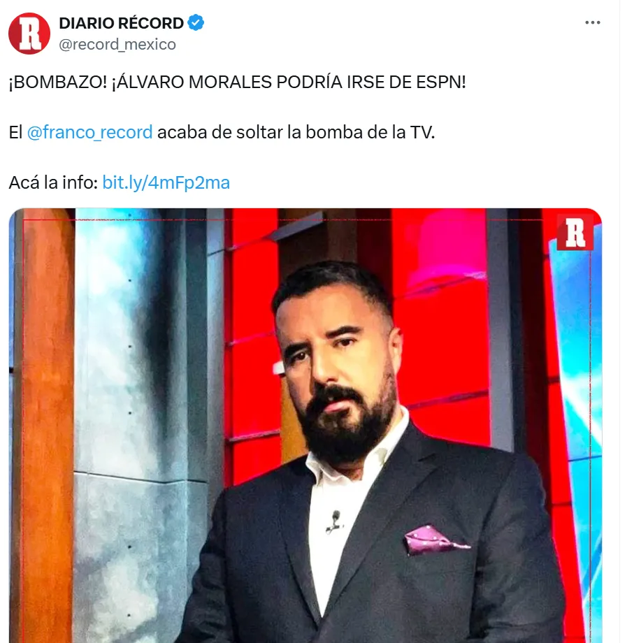 Y por último cerró: “Resulta que la Doña Tele que lidera Carlos Martínez ya eligió la gran carta que quiere para sus mesas de debate, ya puso en la mesa la oferta y está cerca de cerrar el traspaso que será la bomba de fichajes para la pantalla deportiva mexicana: FOX camina con la contratación de… ni más ni menos que… Don Álvaro Morales de ESPN.”