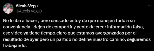“No lo iba a hacer, pero cansado estoy de que manejen todo a su conveniencia, dejen de compartir y creer información falsa, ese video ya tiene tiempo; claro que estamos avergonzados por el resultado de ayer pero un partido no define nuestro camino, seguiremos trabajando”, fue el mensaje del delantero del Toluca en su cuenta de X hace apenas instantes.
