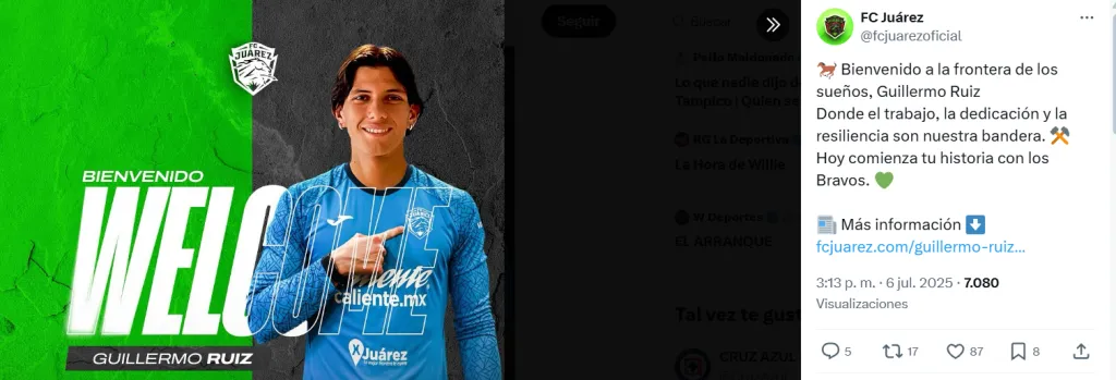 El elegido por los directivos fue el arquero Guillermo Ruiz Ortiz. A sus 21 años, tendrá su primera experiencia lejos del Viejo Continente y quiere empezar a dar pasos importantes, ya que no logró debutar en primera división en España. Una apuesta joven que busca consolidarse en el futbol mexicano.