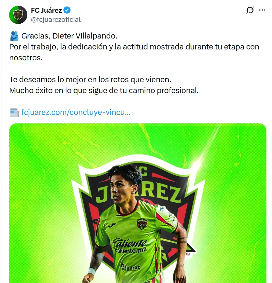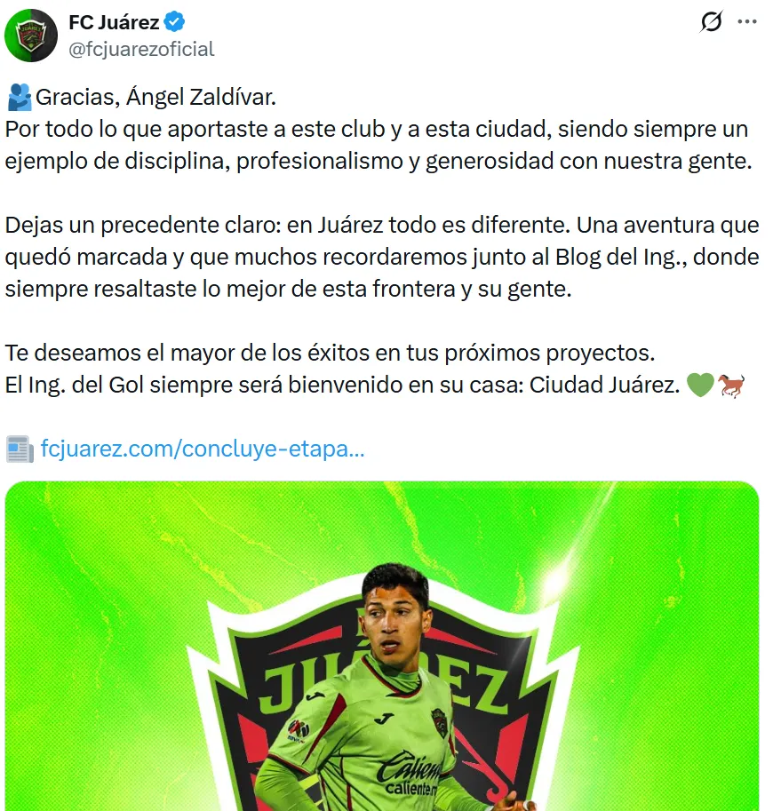 Uno de los despedidos fue Ángel Zaldívar, a quien el club le dedicó un extenso mensaje de agradecimiento: “Gracias, Ángel Zaldívar. Por todo lo que aportaste a este club y a esta ciudad, siendo siempre un ejemplo de disciplina, profesionalismo y generosidad con nuestra gente. Dejas un precedente claro: en Juárez todo es diferente. Una aventura que quedó marcada y que muchos recordaremos junto al Blog del Ing., donde siempre resaltaste lo mejor de esta frontera y su gente. Te deseamos el mayor de los éxitos en tus próximos proyectos. El Ing. del Gol siempre será bienvenido en su casa: Ciudad Juárez”.